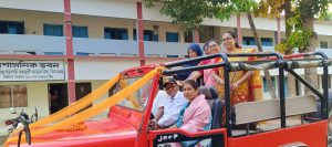 অনুষ্ঠানের বিশেষ আকর্ষণ ছিল ফুল দিয়ে সাজানো একটি ‘চান্দের গাড়ি’ জিপ, যা ঘিরে তৈরি হয় উৎসবমুখর পরিবেশ। অনুষ্ঠান শেষে সেই গাড়িতেই করে প্রিয় শিক্ষককে বাড়ি পৌঁছে দেন শিক্ষার্থীরা, যেন এক রাজকীয় বিদায়।